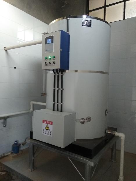 本實用新型公開了一種全自動蓄熱分艙式電開水鍋爐,包括鍋爐本體,所述鍋爐本體內(nèi)部設(shè)有開水艙和加熱艙兩個獨立儲水艙,二者之間通過隔板隔開,隔板上設(shè)有立式推水管,加熱艙通過推水管與開水艙相通;加熱艙中下部設(shè)置有加熱組,且在加熱艙側(cè)面的下部設(shè)有進水口;開水艙側(cè)面底部設(shè)有開水出口,開水艙頂部設(shè)有通大氣口和控制水位高低的兩根水位電極,鍋爐本體上設(shè)有水位計和電控箱。本實用新型生水開水不混合,加熱艙把水燒開后,立即推入開水艙,杜絕了“千沸水”弊端;開水艙一直由加熱艙通過之間的隔板換熱保溫,即使隔夜后也能放出高溫開水;加熱艙和開水艙完全分離,可以滿足集中供應(yīng)開水的需求。